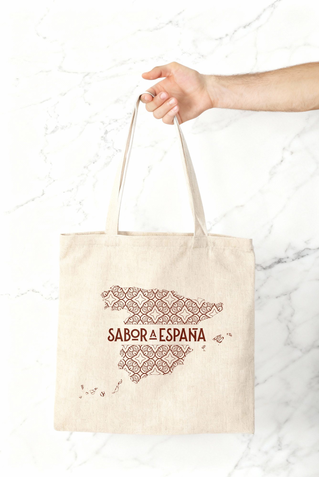 Un elegante tote bag de la marca “Sabor a España”, confeccionada en resistente tejido natural de tono crudo, ideal para el uso diario. En su parte frontal luce un diseño artístico que representa el mapa de España, formado por un patrón ornamental de inspiración tradicional que combina líneas finas y motivos geométricos, otorgándole un aspecto artesanal y distintivo.